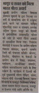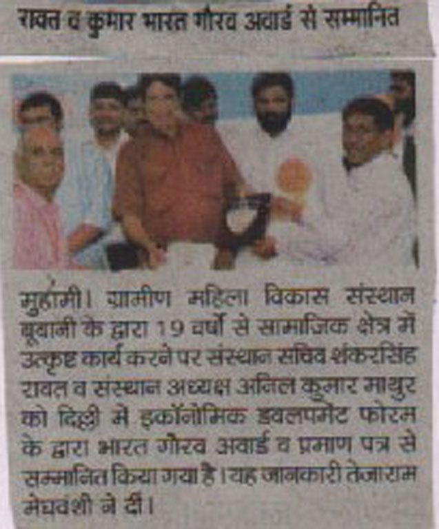 Gramin Mahila Vikas Sansthan Secretary Shankar Singh Rawat was honoured with Bharat Gaurav Award for outstanding achievement in education, health and social services. The award was presented to him during a function on the sidelines of 39th national seminar of Economic Development Forum in New Delhi on September 10, 2015.