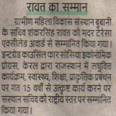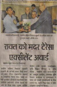 Gramin Mahila Vikas Sansthan Secretary Shankar Singh Rawat was awarded Mother Teressa Excellent Award by the Integrated Council for Socio Economy Progress, Kerala. The function was presided over by the Union Minister MV Rajasekharan. Many notable personalities from politics, bureaucracy, NGO sector, etc., were present on the occasion.
