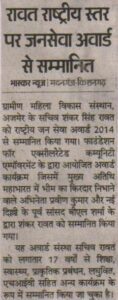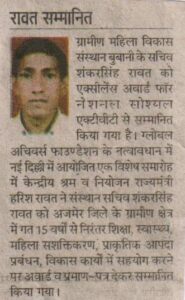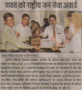 GMVS secretary Shankar Singh Rawat was honoured with Rashtriya Jan Sewa Award 2014. The award was given by Foundation for Accelerated Community Empowerment at a function organised in New Delhi. Television actor Praveen Kumar and former Member of Parliament BL Sharma jointly felicitated Rawat.