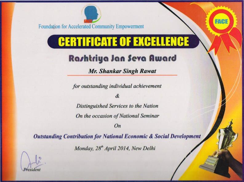 GMVS secretary Shankar Singh Rawat was honoured with Rashtriya Jan Sewa Award 2014. The award was given by Foundation for Accelerated Community Empowerment at a function organised in New Delhi. Television actor Praveen Kumar and former Member of Parliament BL Sharma jointly felicitated Rawat.